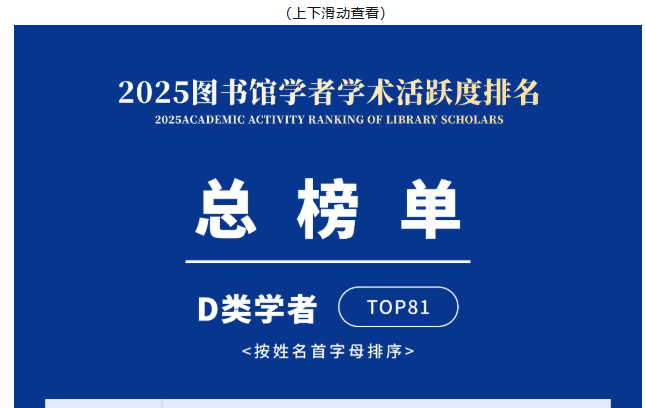 易斌馆长长期致力于图书馆学、情报学的研究与实践工作,积极投身于学术探索与知识创新。此次荣登学术活跃度排名榜,不仅是对其个人在过去五年间持续进行高质量学术活动、产出学术成果的肯定,也充分体现了我校在推动学术研究、优化学术环境方面取得的显著成效。